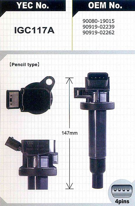 Катушка зажигания / YEC для Toyota Corolla 1999- RAV4 2000-2005 Avensis 2000-2008 Auris 2006-2008 Wish 2003-2009 Passo 2004; IGC117A; (TG9091902239 1.2.24 IGC104A) 9008019015